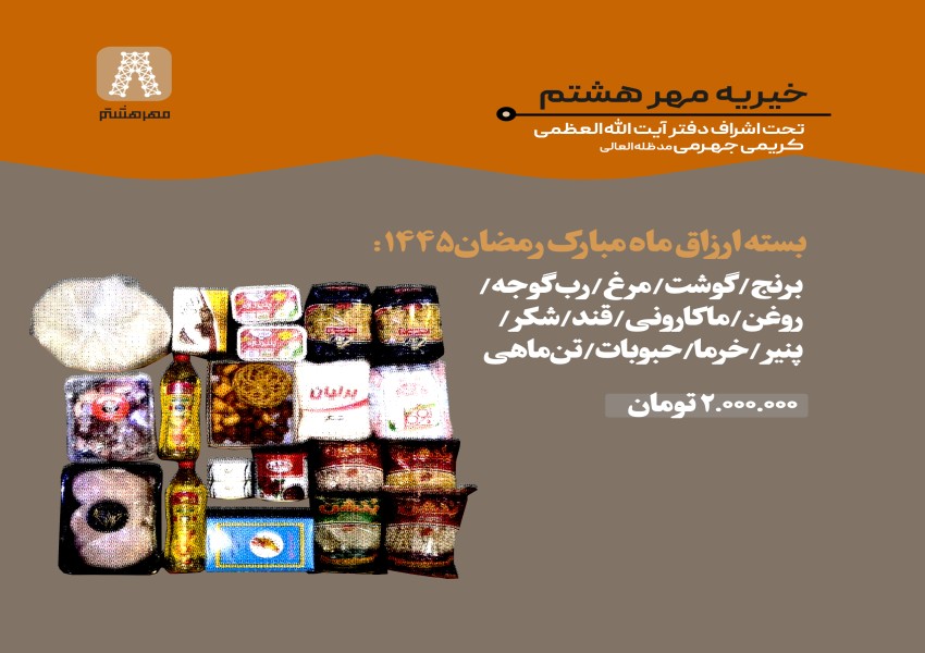 طبق برنامه سال گذشته و همزمان با آغاز ماه مبارک رمضان و سال جدید، طرح توزیع آذوقه توسط خانه خدمات اجتماعی مهر هشتم زیر نظر دفتر آیت الله العظمی کریمی جهرمی انجام میگیرد.