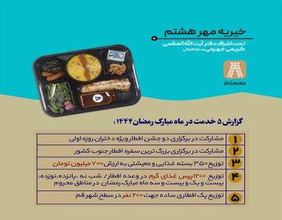 بنا به توصیه مکرر آیت الله العظمی کریمی جهرمی پیرامون کمک به نیازمندان در ماه مبارک رمضان، مرکز خیریه مهر هشتم با استفاده از وجوهاتی که توسط مقلدین معظم له تحت عنوان تبرعات و امور خیریه پرداخت شده بود، توانست بیش از دو هزار نفر را در این ماه مبارک بر سر سفره ی احسان امام حسن مجتبی علیه السلام میهمان نماید.