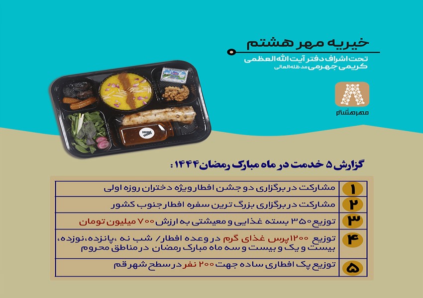 از آغاز ماه مبارک رمضان و بنا به توصیه مکرر آیت الله العظمی کریمی جهرمی پیرامون کمک به نیازمندان در این ماه، مرکز خیریه مهر هشتم با استفاده از وجوهاتی که توسط مقلدین معظم له تحت عنوان تبرعات و امور خیریه پرداخت شده بود، توانست بیش از هزار نفر را در این ماه مبارک بر سر سفره ی احسان امام حسن مجتبی علیه السلام میهمان نماید.