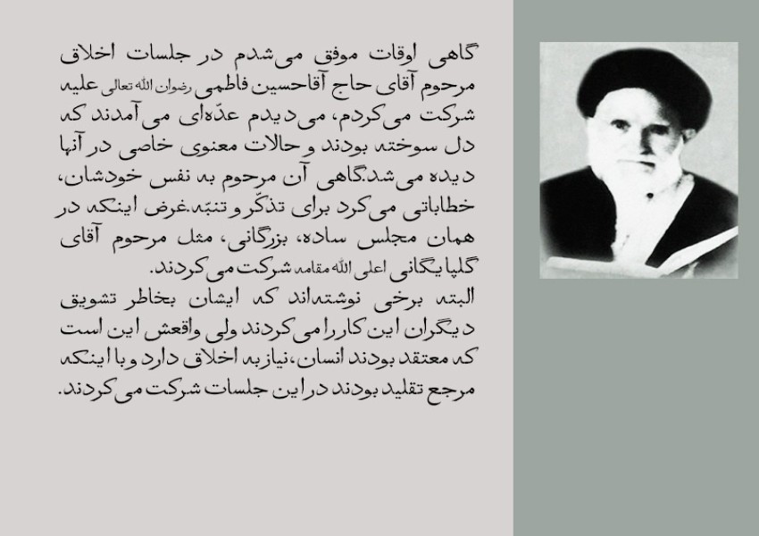 البته برخی نوشتهاند که ایشان بخاطر تشویق دیگران این کار را میکردند ولی واقعش این است که معتقد بودند انسان، نیاز به اخلاق دارد و با اینکه مرجع تقلید بودند در این جلسات شرکت میکردند. بنده یک وقتی از ایشان سوال کردم که وقتی شما در درس آقای حاج شیخ عبدالکریم میرفتید، آیا استفاده میکردید؟