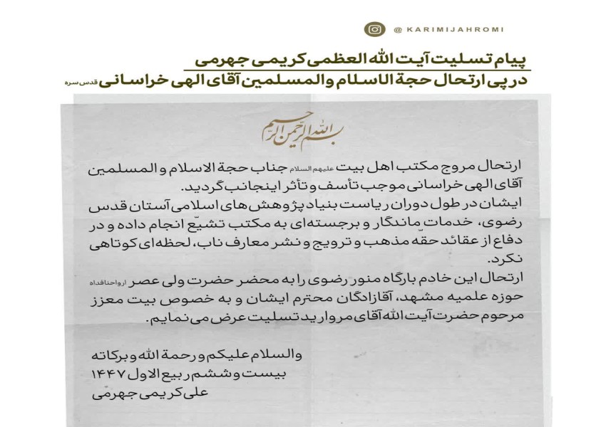 ارتحال مروّج مکتب اهل بیت علیهم السلام جناب حجة الاسلام و المسلمین آقای الهی خراسانی موجب تأسف و تأثر اینجانب گردید.