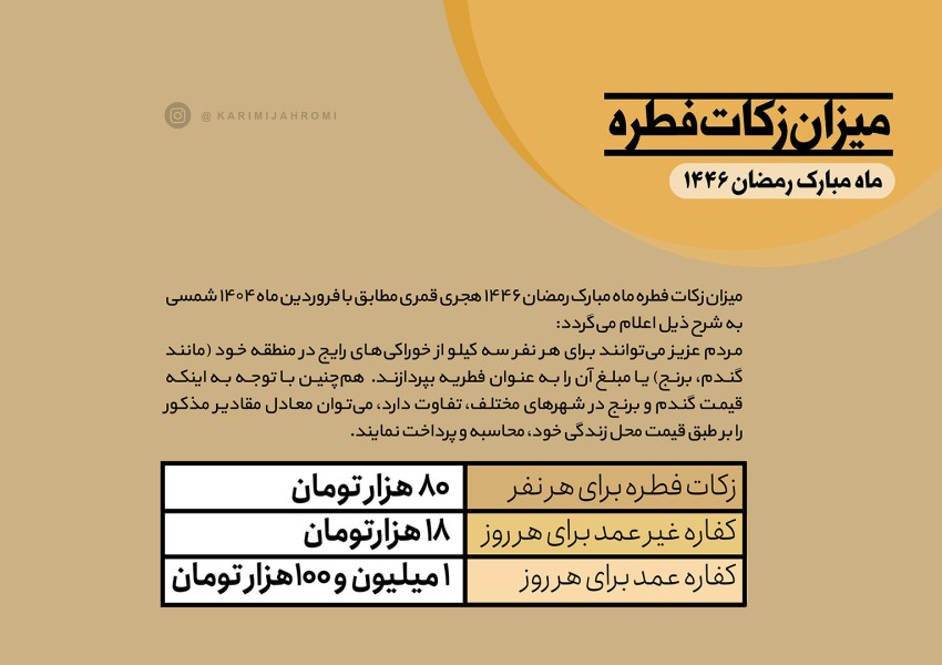 میزان زکات فطره ماه مبارک رمضان 1446 هجری قمری مطابق با فروردین ماه 1404 شمسی به شرح ذیل اعلام می گردد: