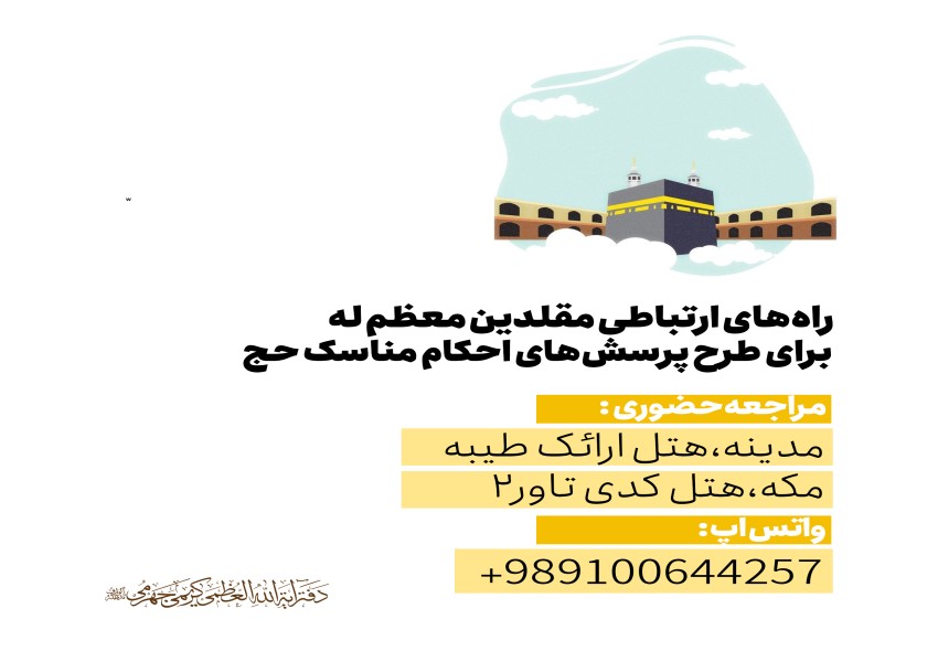 همزمان با ورود زائران بیت الله الحرام به سرزمین وحی، مقلّدان آیت الله العظمی کریمی جهرمی میتوانند جهت طرح پرسشهای خود در رابطه با احکام مناسک حج در شهر